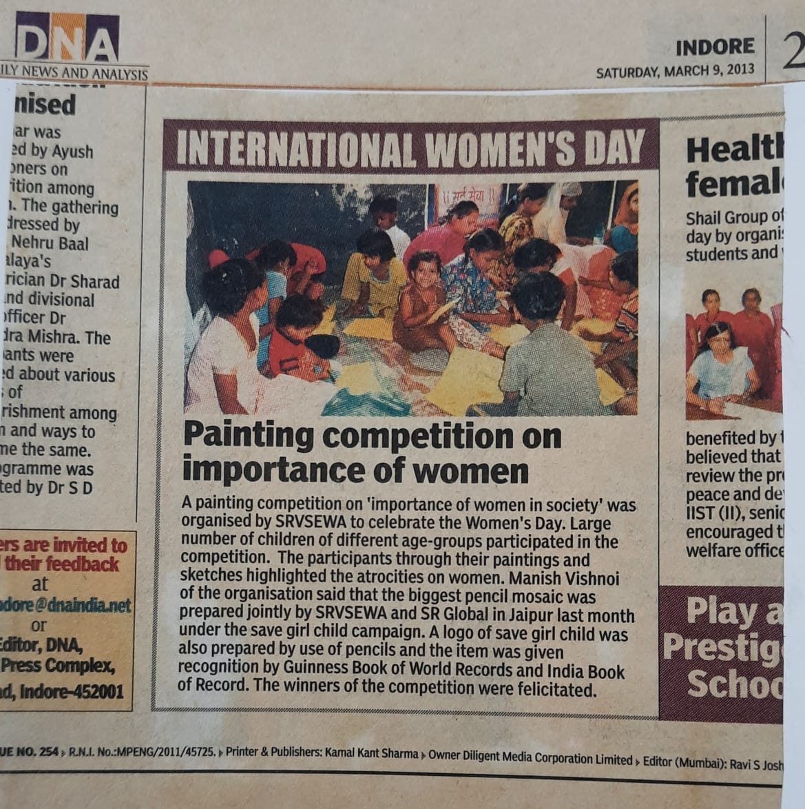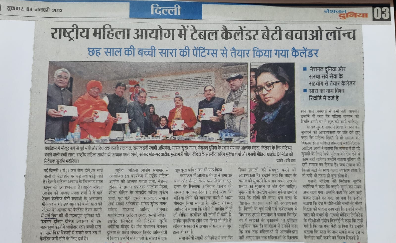Save Girl Child Calendar Made by a Girl “Sara” and Sanstha SRV SEWA and National Duniya  support to Published this as a Calendar.